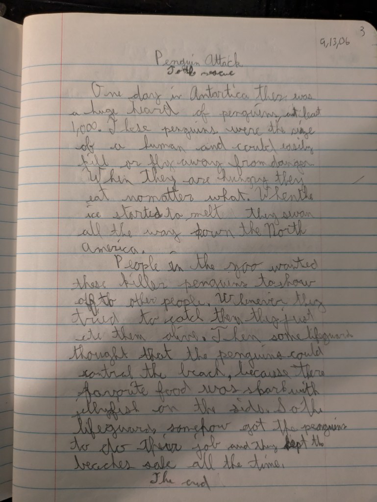 One day in Antarctica there was a huge heard of penguins, at least 1,000. These penguins were the size of a human and could easily kill or fly away from danger. When they are hungry they eat nomatter what. When the ice started to melt they swam all the way down the North America.
